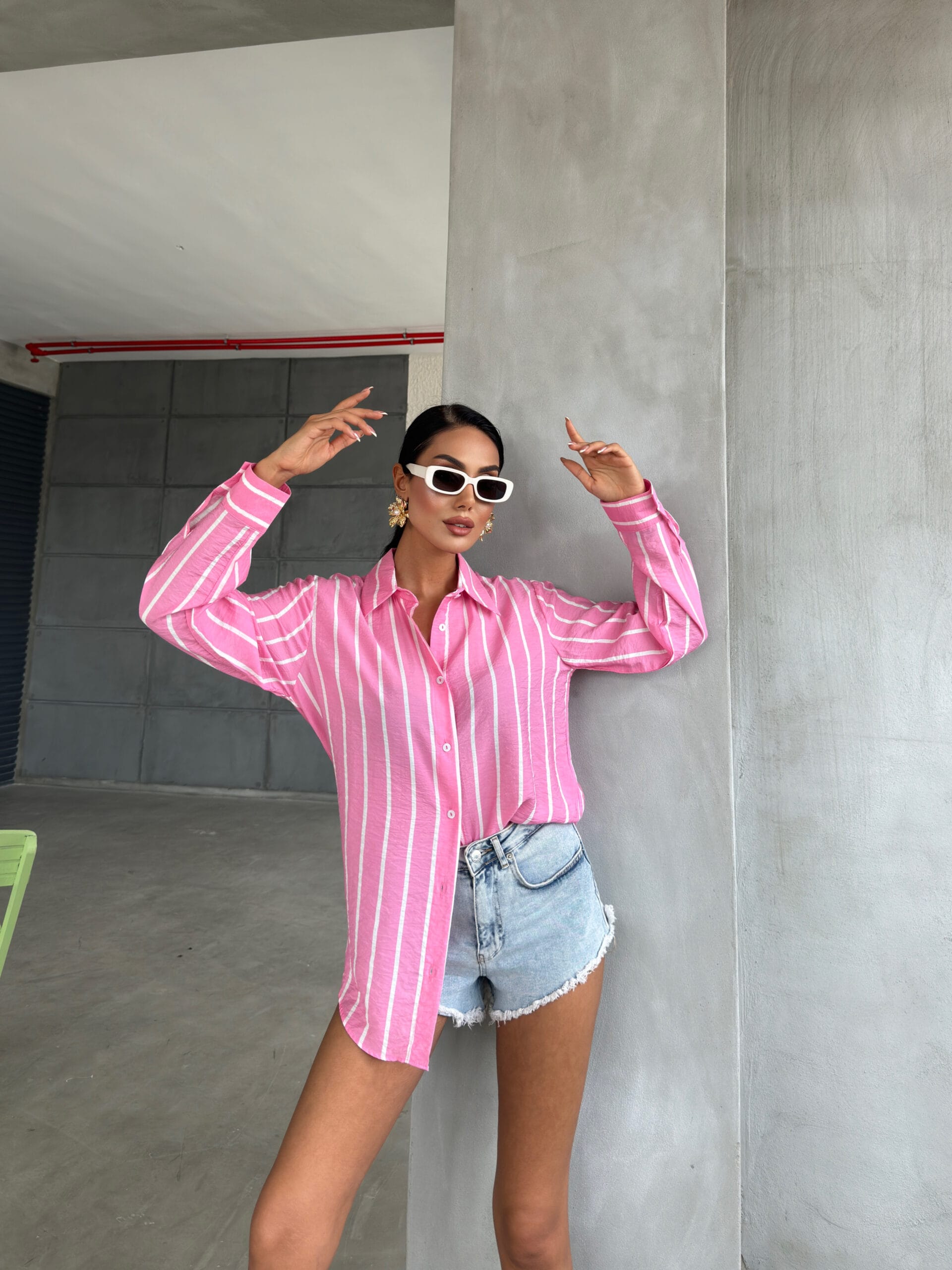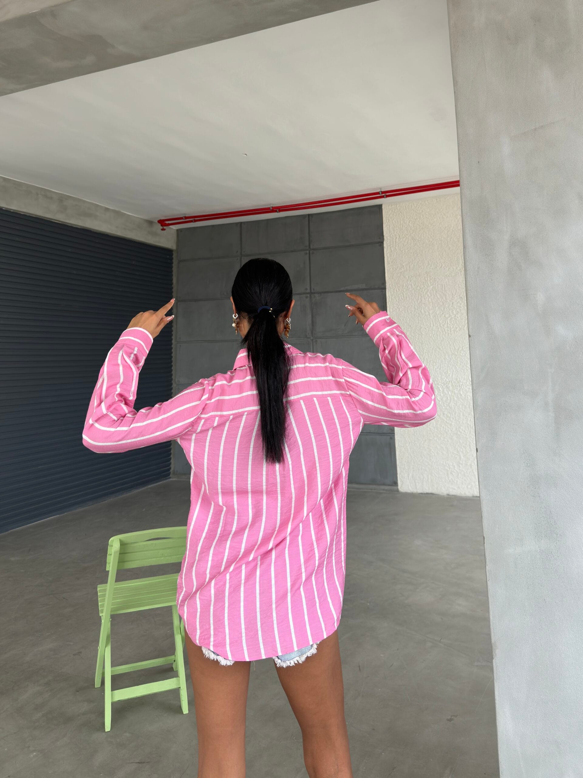 Bleik skyrta með hvítum röndum sem fangar augun og gefur ferskt og létt yfirbragð. Hún er laus í sniði og úr léttu efni sem andar vel – fullkomin til að klæðast með stuttbuxum eða við gallabuxur fyrir hversdagslegt og smart útlit.