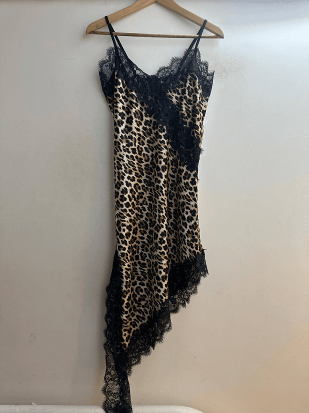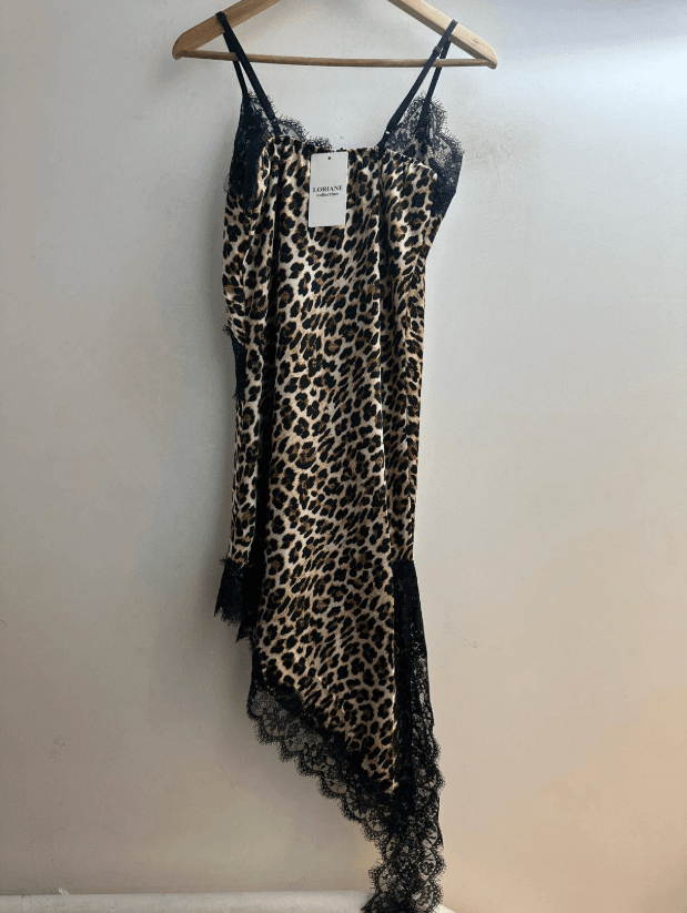 Silkimjúkur satín kjóll með fallegu leopard mynstri og blúndu, með smá teygju