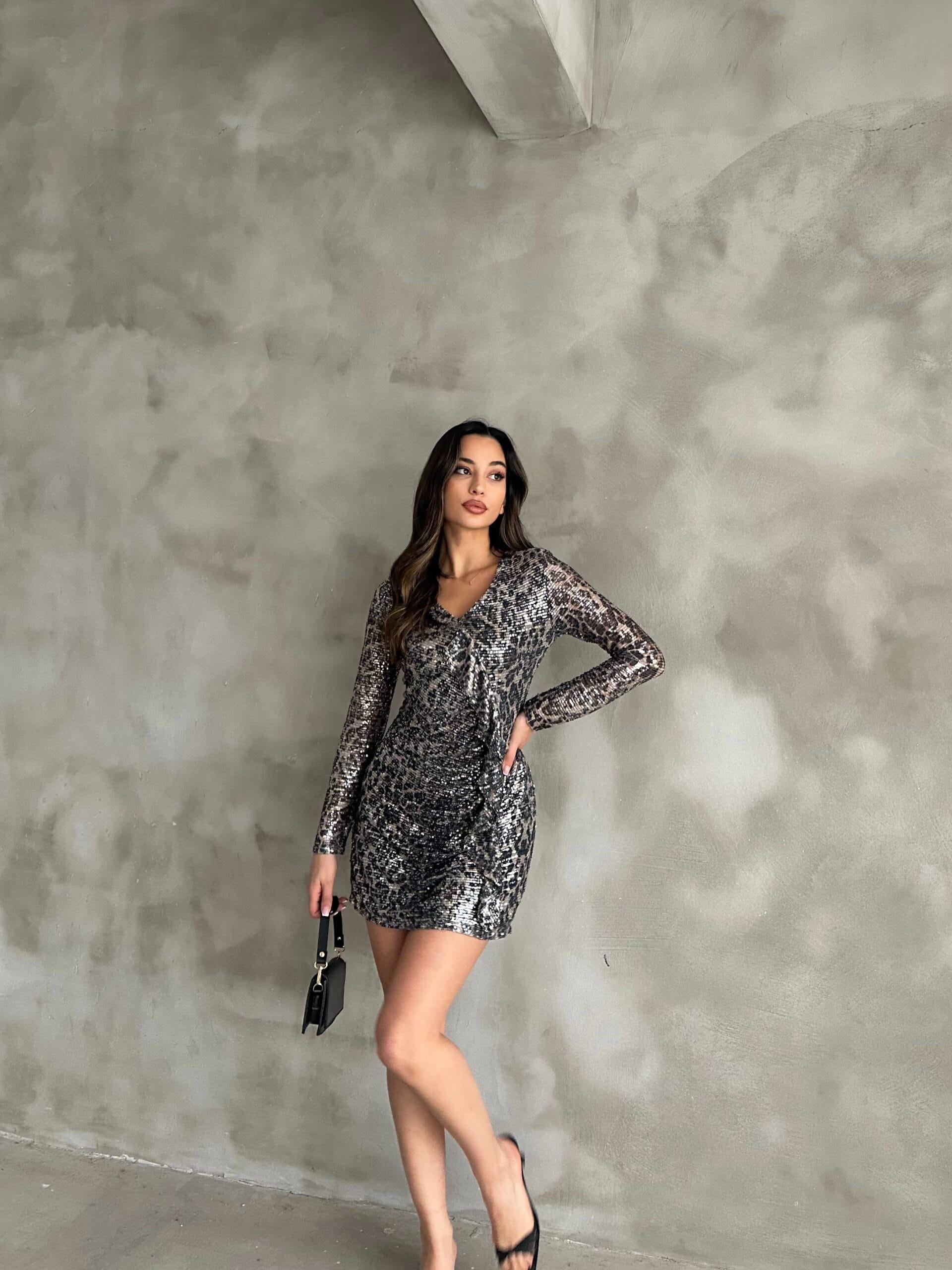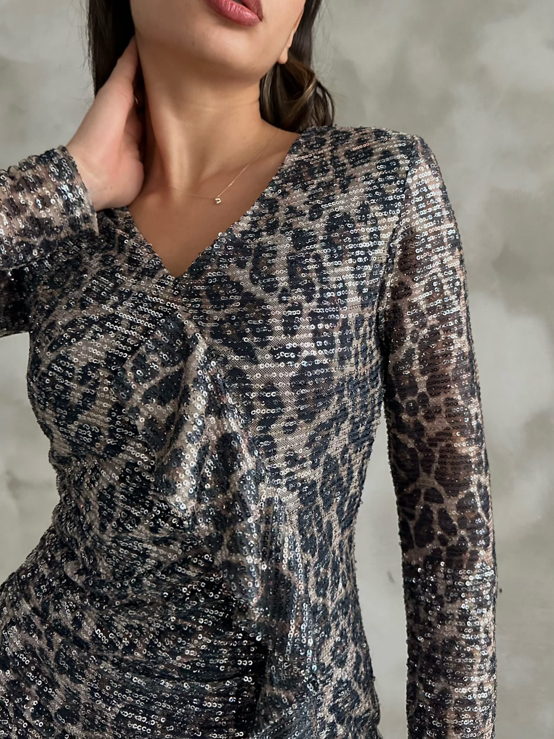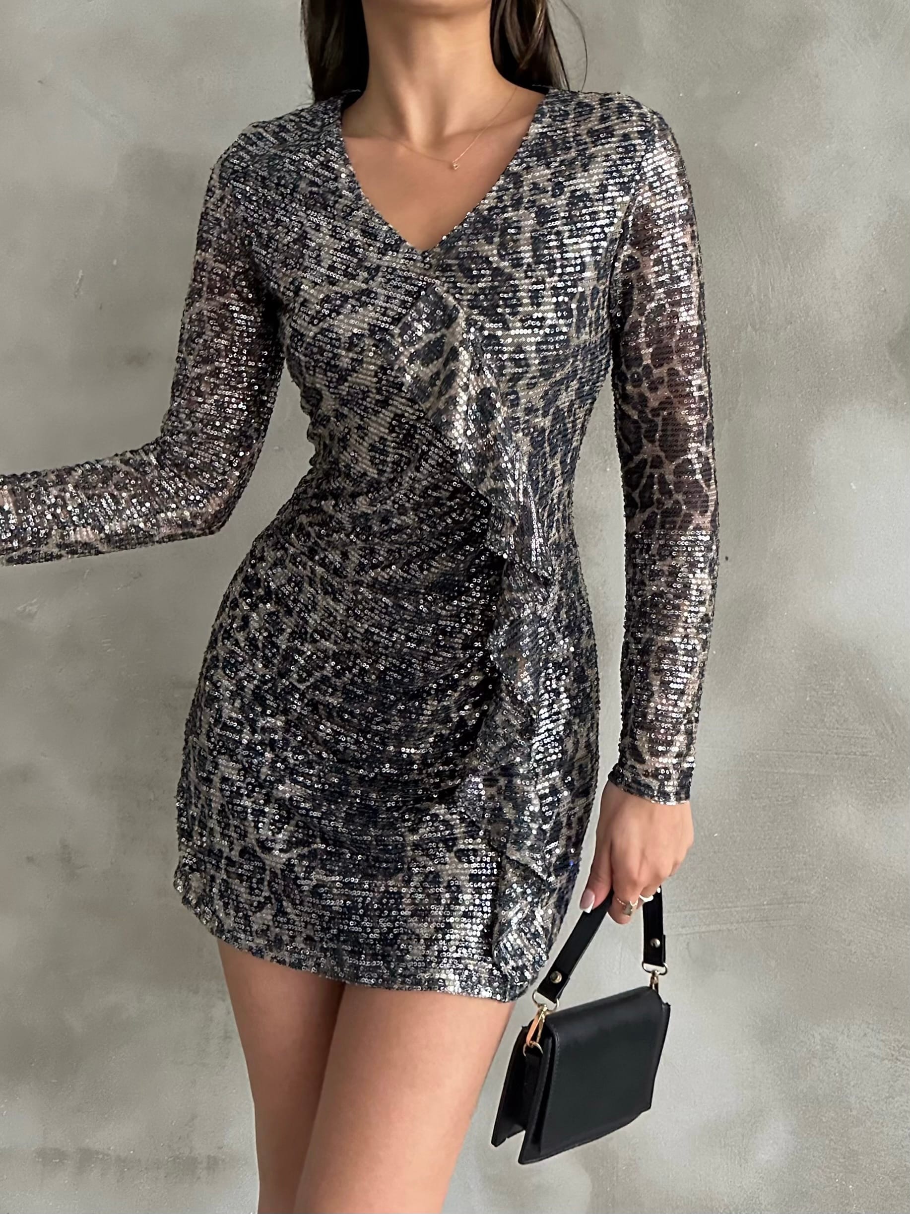 Stígðu inn í sviðsljósið með þessum glitrandi kjól sem sameinar djarfa glamúrinn og rándýra fegurð. Kjóllinn er úr teygjanlegu efni með hlébarðamynstri, skreyttur silfraðri pallíettu sem fangar birtuna í hverju skrefi. Þétt sniðið leggur áherslu á kvenlegar línur, á meðan v-laga hálsmálið og rúnaðir faldar gefa hann bæði fágaðan og áberandi svip.