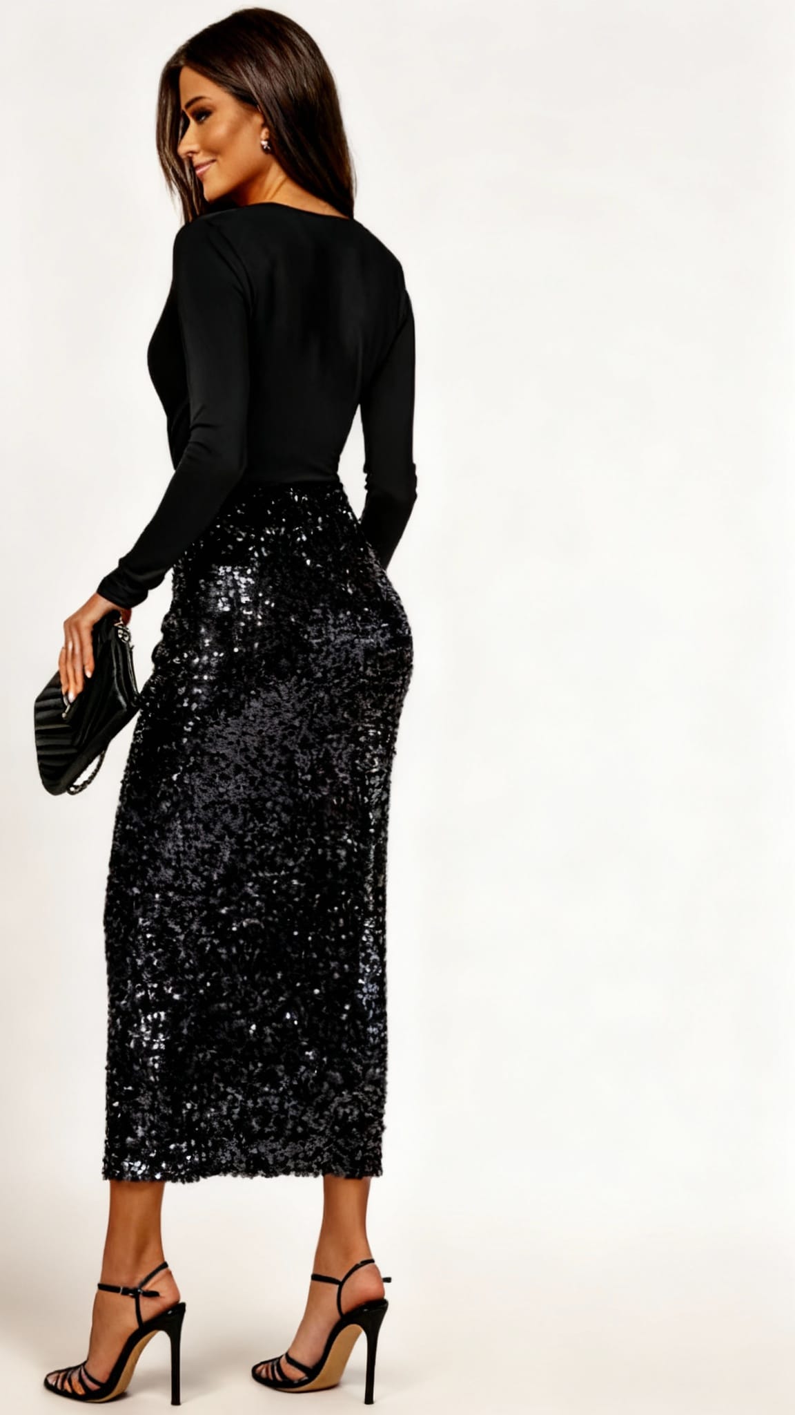 Svartur palíettu kjóll sem glitrar með stæl, með smá teygju
